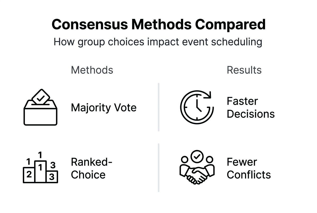 Not all consensus methods work the same way. The mechanism you choose directly impacts how fast you reach a decision and how satisfied participants feel with the outcome. Majority voting and ranked-choice voting represent the two most popular approaches for event scheduling, each with distinct advantages.