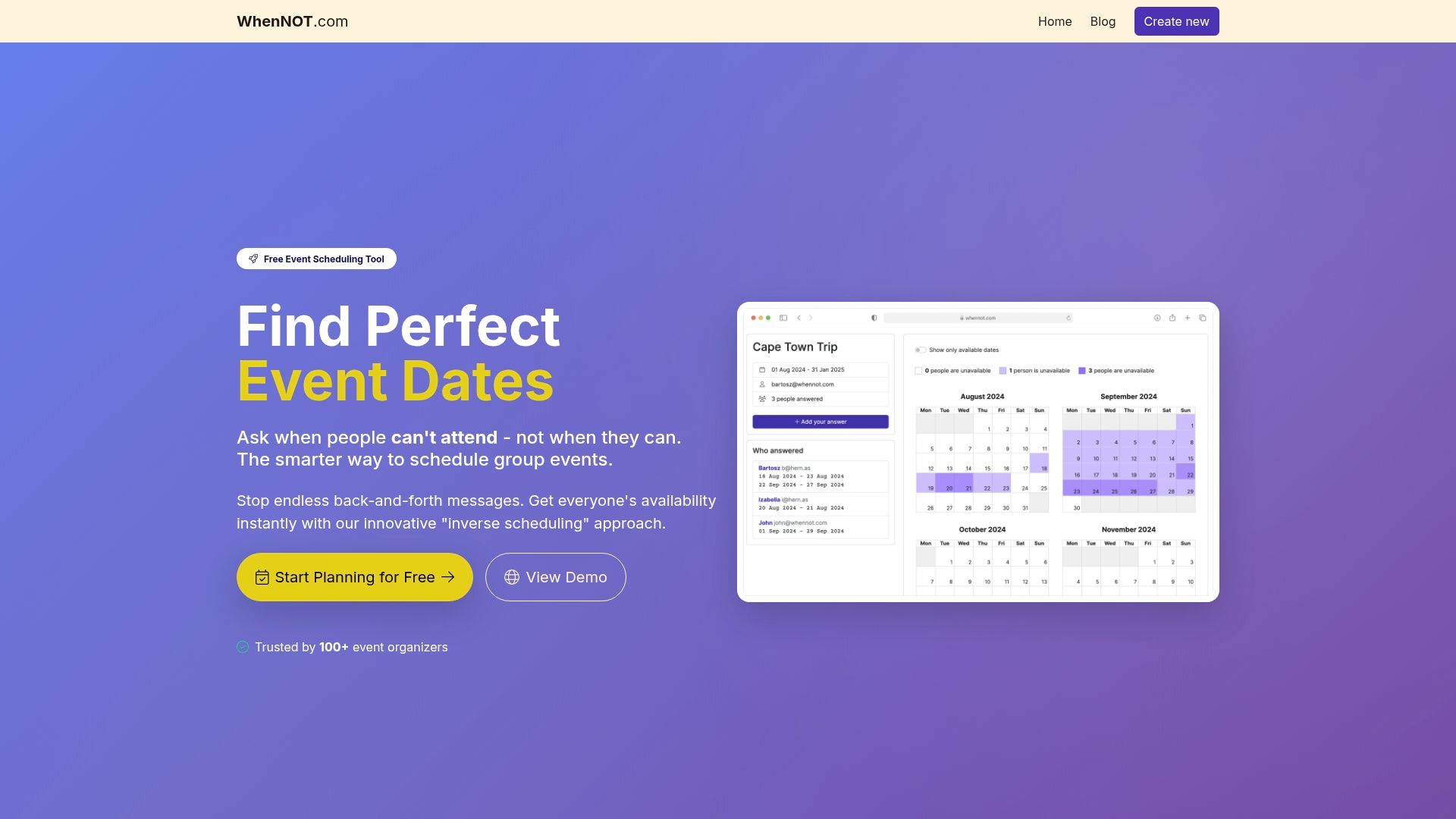 Experience how WhenNOT revolutionizes group event planning by asking participants when they are NOT busy instead of when they are free. This approach simplifies collecting availability especially for multi-day or flexible date events. Without requiring signups or accounts, your attendees can quickly mark unavailable dates, making it easier to identify the best date range and finalize your event logistics. Get started today to streamline your event coordination, reduce communication delays, and confidently plan successful gatherings with minimal hassle.