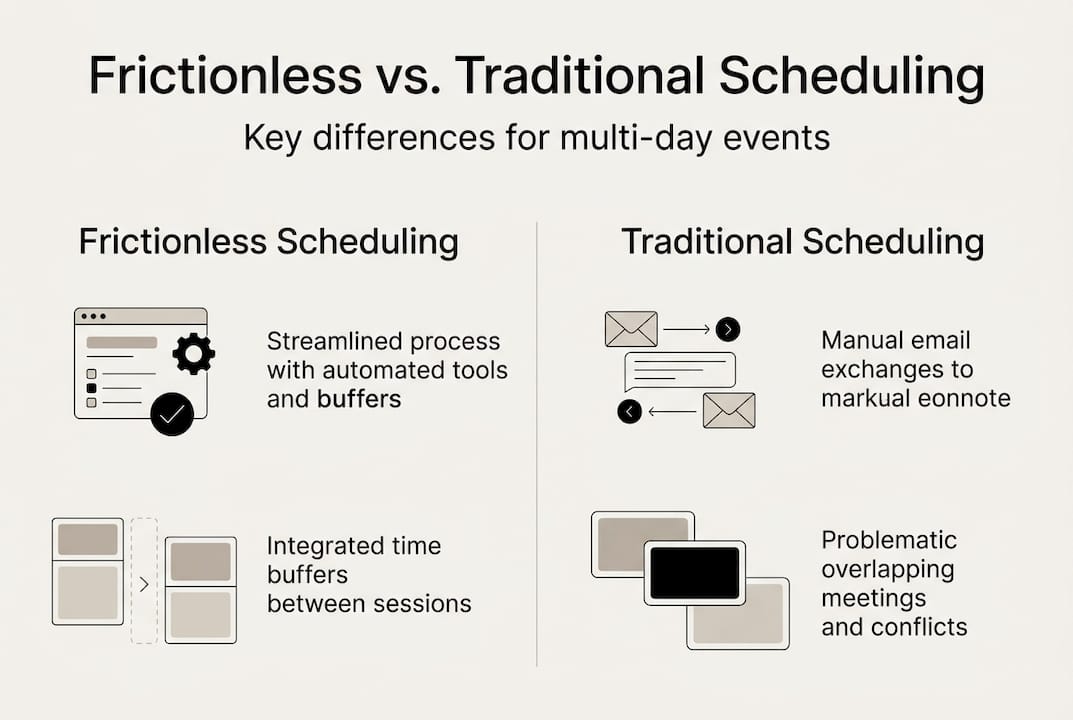 Multi-day events amplify these challenges exponentially. You're not just finding one meeting slot but coordinating multiple sessions, meals, breakouts, and travel across days or weeks. Each additional day multiplies potential conflicts and dependencies. Frictionless scheduling addresses this complexity through: