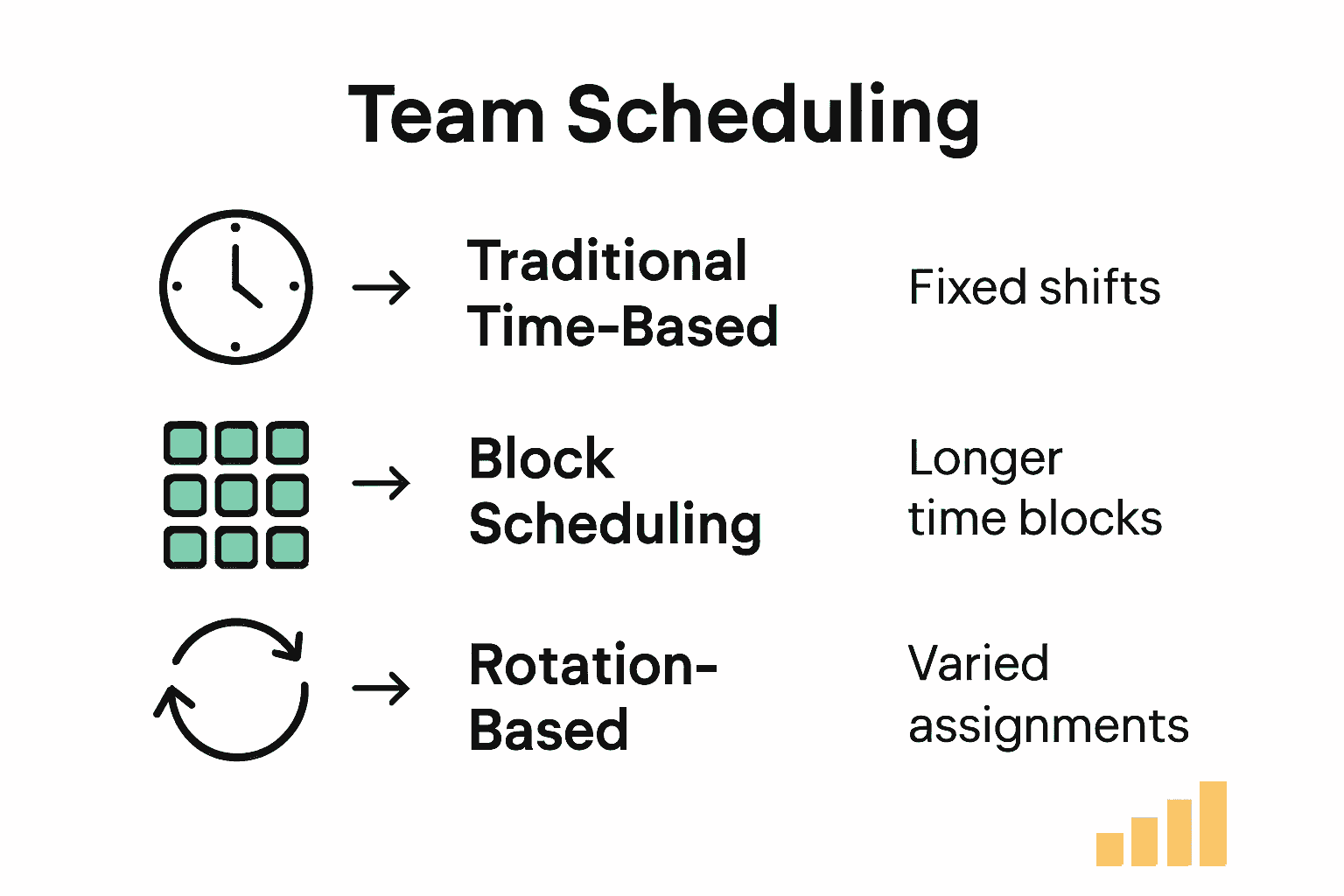 The primary scheduling methods include Traditional Time-Based Scheduling, Block Scheduling, and Rotation-Based Scheduling, each offering unique frameworks to improve team coordination and productivity.
