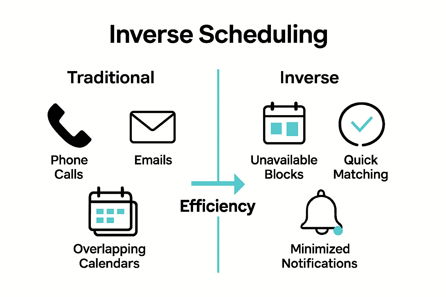 Inverse scheduling focuses on identifying unavailable times for team members rather than seeking available times. This approach reduces communication overhead, minimizes scheduling conflicts, and provides a clearer view of team constraints to improve overall efficiency in planning.