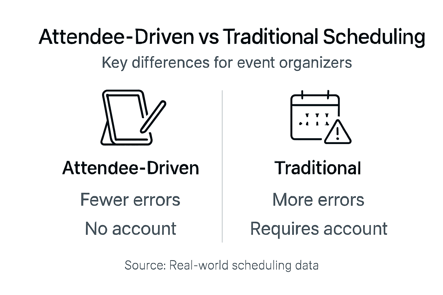 Attendee-driven scheduling achieves faster decisions, fewer errors, and better scalability without requiring accounts. Traditional methods can work for very small groups with fixed dates, but struggle as group size and event duration increase.