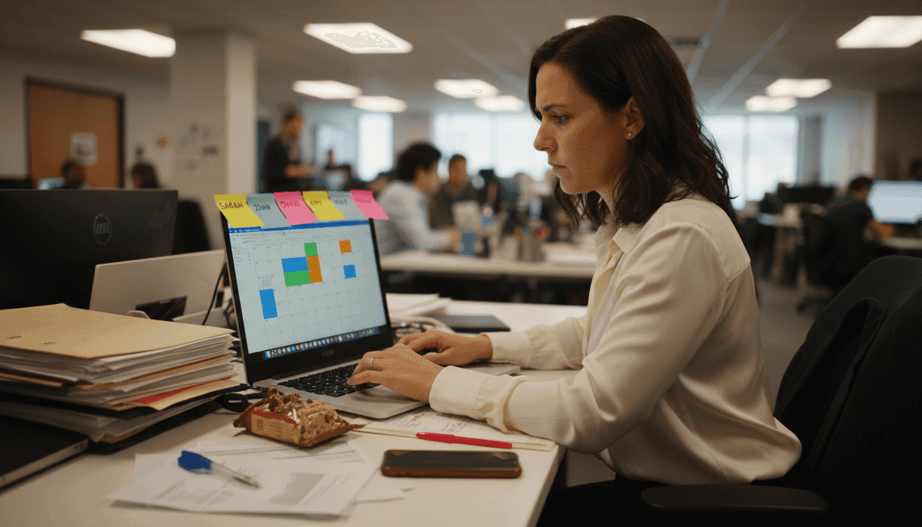 - Personnel conflicts: Employees double-booked across meetings, workshops, or team-building activities