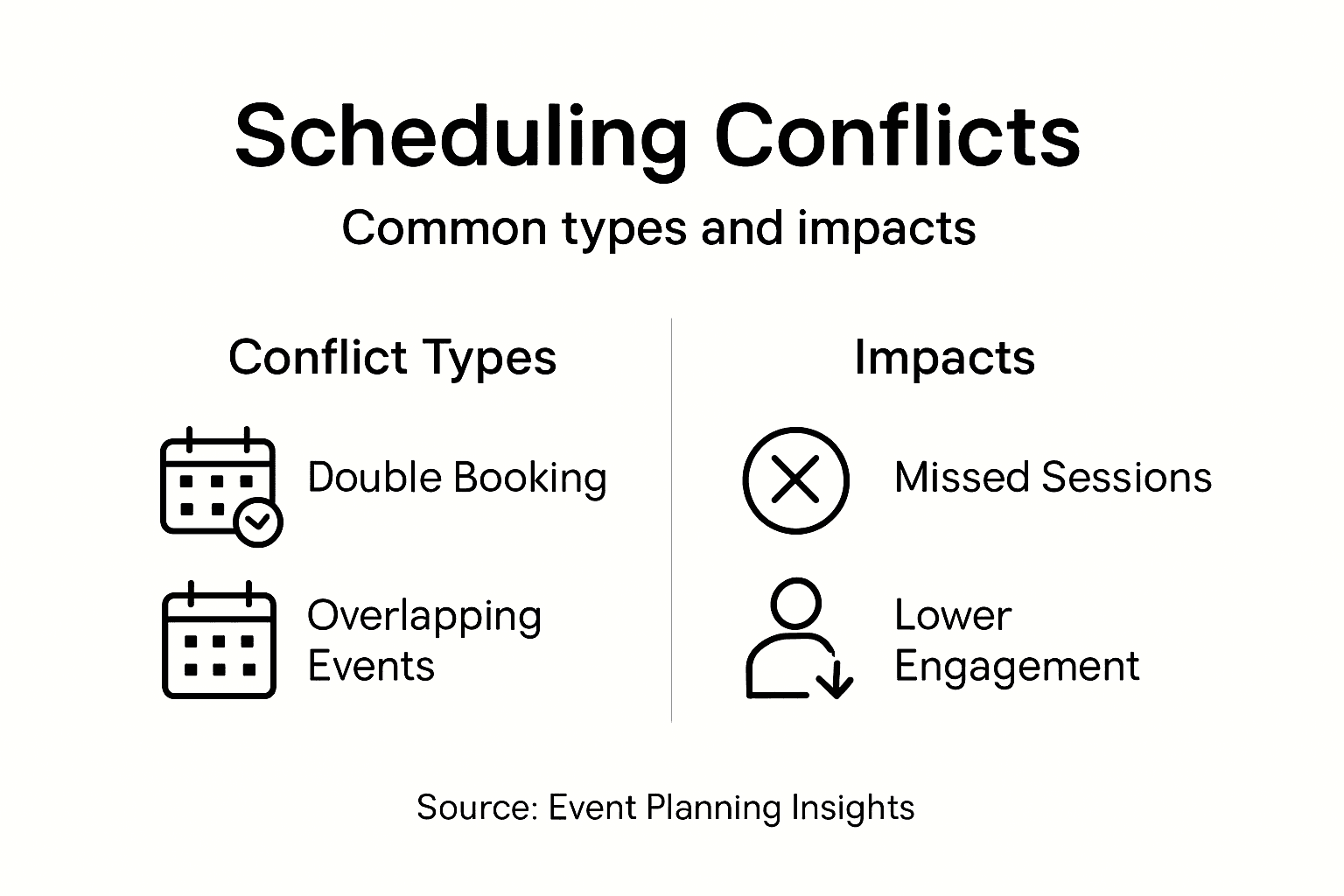 | Double Booking | Same person assigned to two events | Lost expertise at sessions | Reduced team engagement |