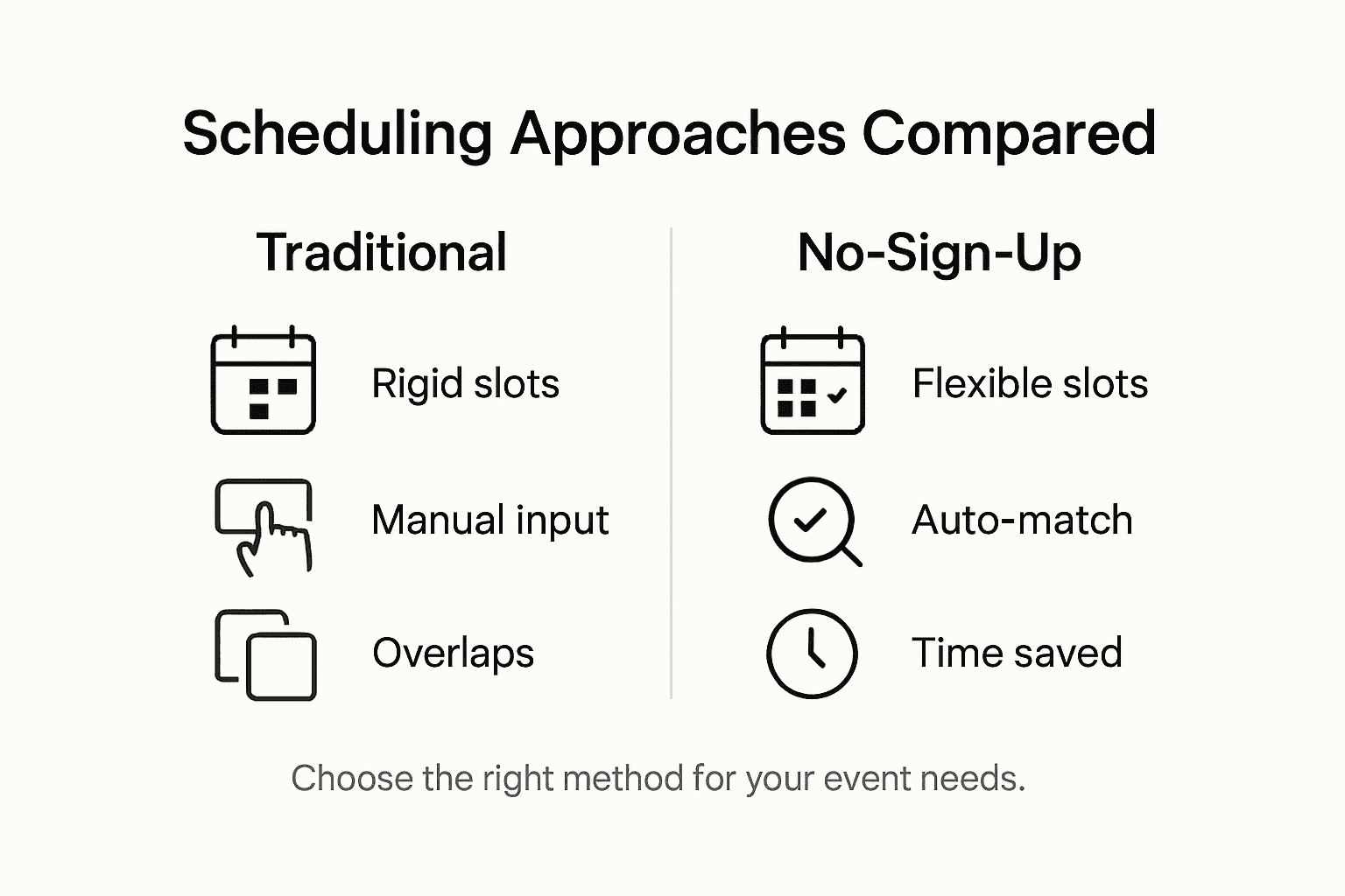 | No-Sign-Up (Automated) | Large events with standard schedules | Less user customization |