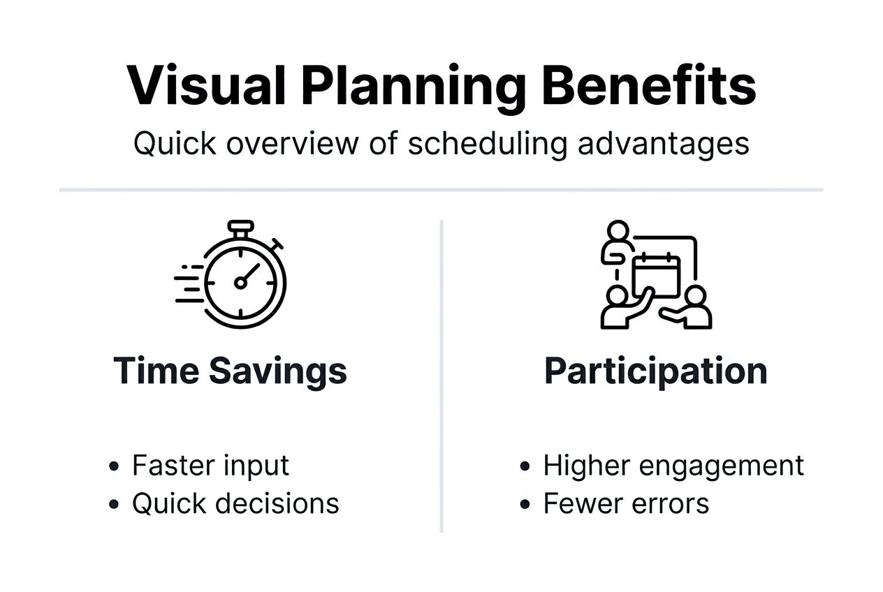 Organizers typically save 3 to 5 hours per multi-day event compared to manual coordination methods. Scheduling emails decrease by approximately 50%, and planning cycles shorten from weeks to days through automated availability collection and visual decision support.